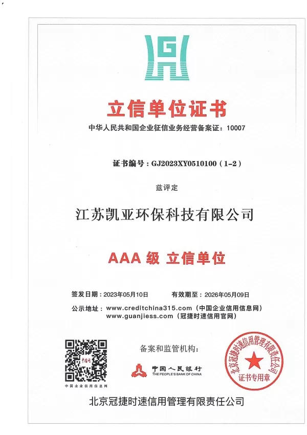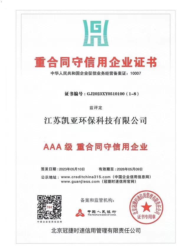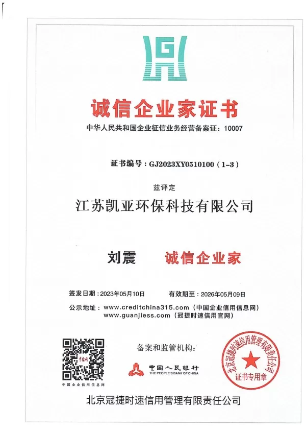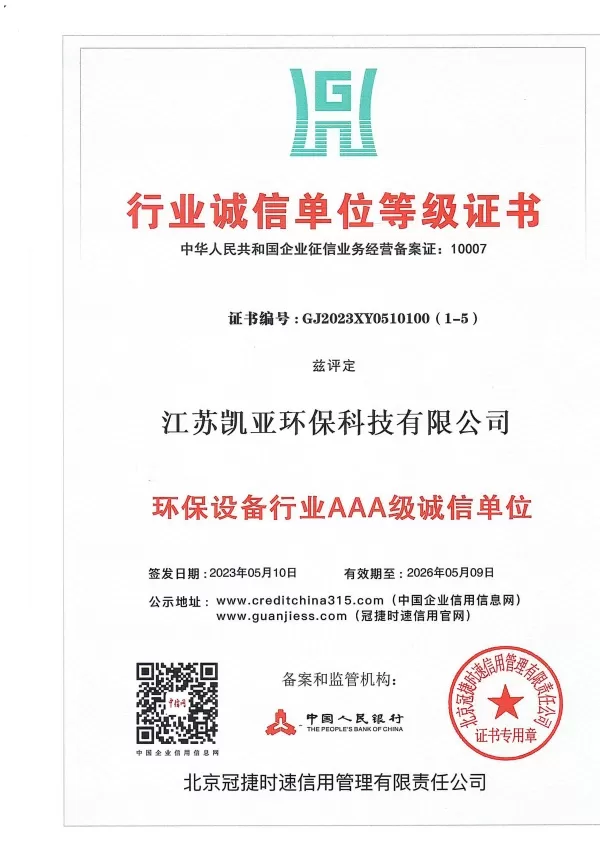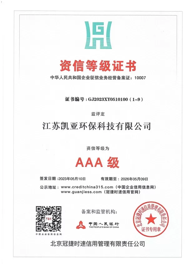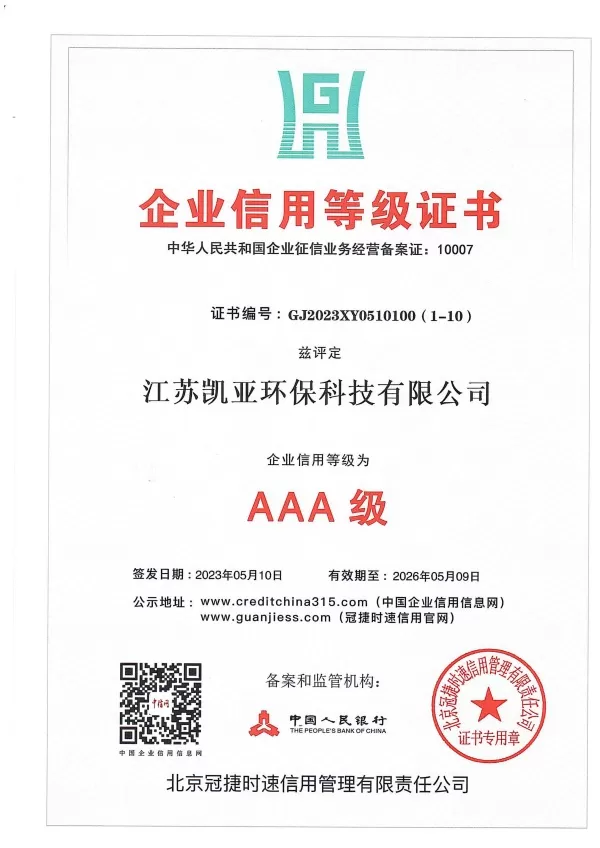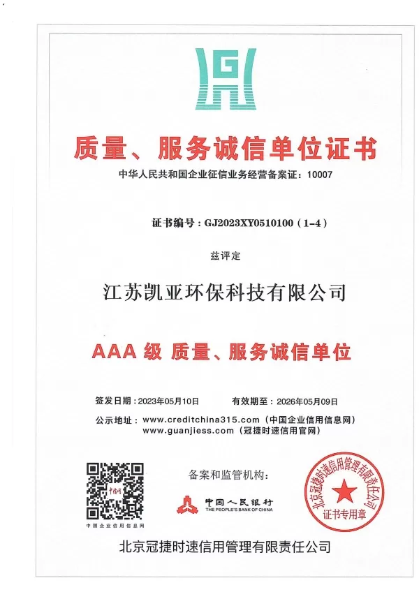 Jiangsu Kaiya Environmental Protection Technology Co., Ltd as a national high-tech enterprise, a private small and medium-sized technology enterprise in Jiangsu Province,  Jiangsu Kaiya Environmental Protection Technology Co., Ltd. has obtained the Level A certification for the integration of informatization and industrialization, CE certification, ISO certifications. It has also been awarded the title of "Jiangsu Province AAA-Level Integrity Demonstration Unit". Currently, the company has obtai...
