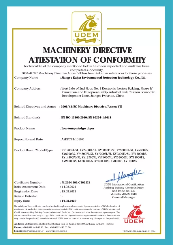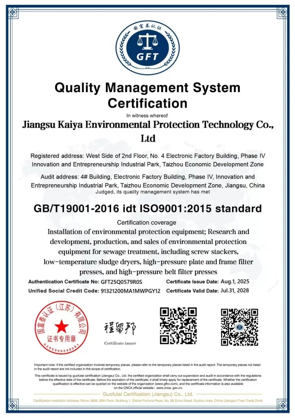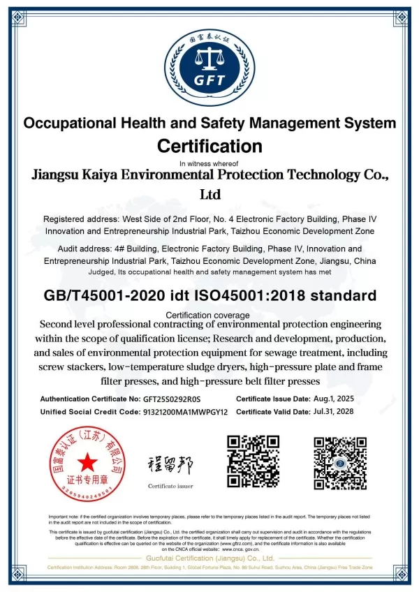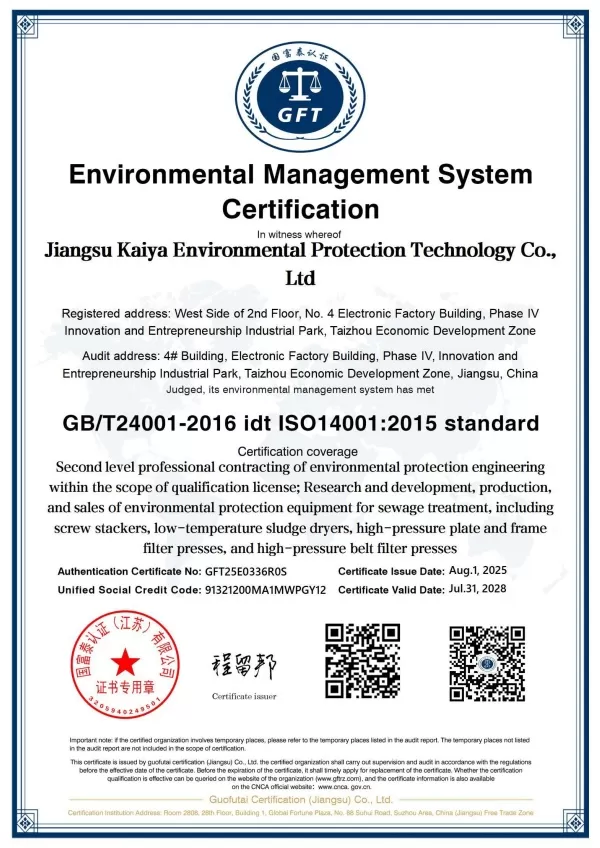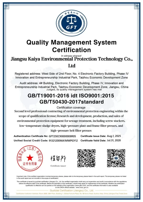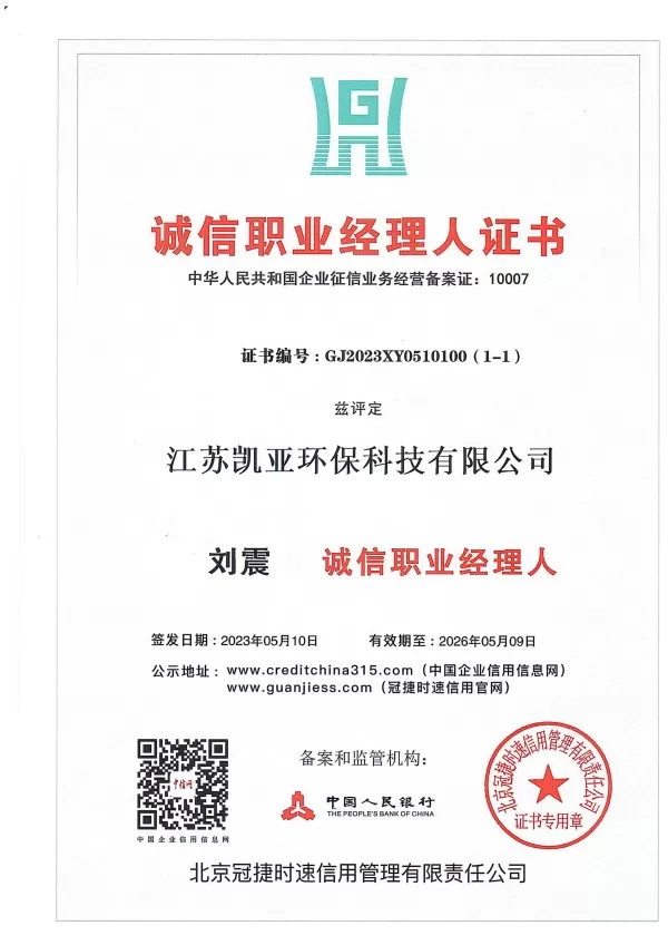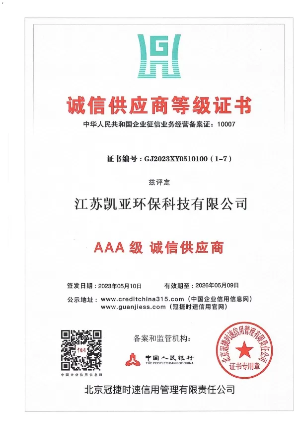 Jiangsu Kaiya Environmental Protection Technology Co., Ltd as a national high-tech enterprise, a private small and medium-sized technology enterprise in Jiangsu Province,  Jiangsu Kaiya Environmental Protection Technology Co., Ltd. has obtained the Level A certification for the integration of informatization and industrialization, CE certification, ISO certifications. It has also been awarded the title of "Jiangsu Province AAA-Level Integrity Demonstration Unit". Currently, the company has obtai...