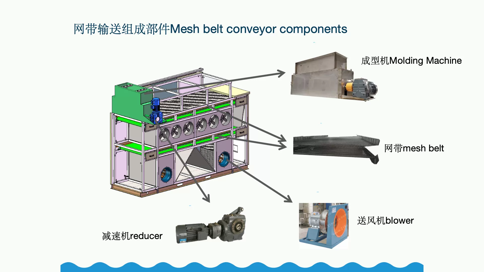 Waste Heat Belt Sludge Drying Machine: The waste heat from flue gas or steam isused to heat circulatingwater to 90°C hot water through a heat exchanger. insidethe equipment, the circulating air passes through a hot water coil heat exchangerto be heated into dry hot air. A fan then directs this dry hot air upward across thesludge on the mesh belt. As the dry hot air moves through two layers of the sludgemesh belt, it becomes humid hot air with humidity above 50% and a temperaturebetween 40 and 60 degrees Celsius. This humid hot air is recirculated by the fanthrough a bag filter into a cold water coil, where it exchanges heat with coolingwater at around 33 degrees Celsius. Once the humid hot air reaches its dew pointtemperature, the water vapor condenses into water and is discharged. The driedair then exchanges heat again with the 90°c hot water, repeating the cycle.Throughout this process, the circulating air operates in a sealed space withoutemitting any exhaust gases.