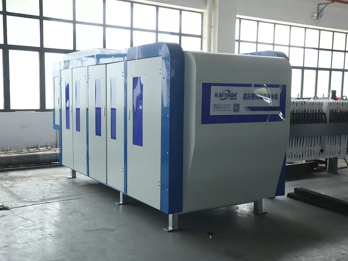 Jiangsu Kaiya Environmental Protections newly developed high-pressure belt deep dewatering machine can operate contin.uously to perform secondary deep dewatering on sludge. Deep dewatering ofsludge involves modifying and conditioning thesludge after primary dewatering, disrupting cell walls to release water adsorbed by the cell walls and water inside the cellsUnder the action of conditioning agents, the sludge releases the water adsorbed by the cells and the internal water, which isthen discharged after deep dewatering, The moisture content of the dewatered sludge can reach below 60%.