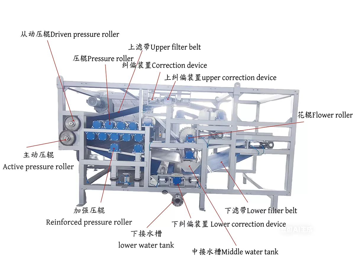 The belt dewatering machines in the sludge dewatering industry can be divided into three core series according to their technical charac.teristics and applicable scenarios: belt pre-concentrator, ordinary belt dewatering machine and heavy-duty belt dewateringA high- eficiency dewatering solution for the entire sludge treatment process has been developed. Among these, the belt pre-dewateringmachine achieves rapid pre-dewatering of sludge through gravity filtration, significantly reducing the sludge volume in subsequent dewatering stages, with advantages of low energy consumption and high integration; conventional belt dewatering machines use traditional roller pressing principles, featuring simple structure and easy operation, suitable for continuous dewatering needs of municipasludge and other regular materials; heavy-duty belt dewatering machines, through multi-stage pressurized roller groups and extendedfilter belt path design, deeply remove sludge from water under high-pressure shearing action, especialy suitable for deep dewateringscenarios involving industrial sludee, oily sludge, and other challenging materials, These three tvpes of eguioment complement eachother to form a gradient technology system, capable of meeting different sludge dewatering reguirements based on moisture contentviscosity, and treatment scale, serving as core equipment for sludge reduction and resource recovery.