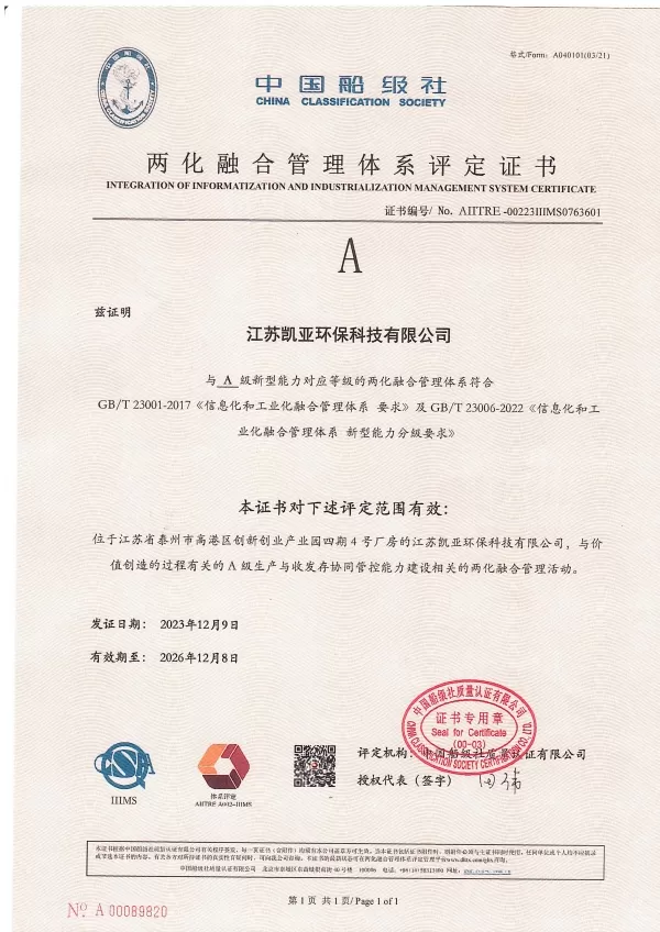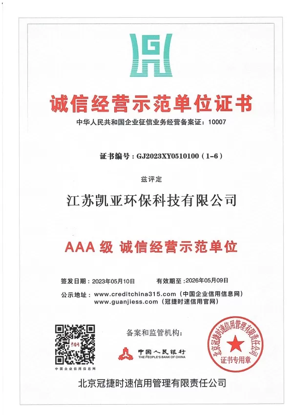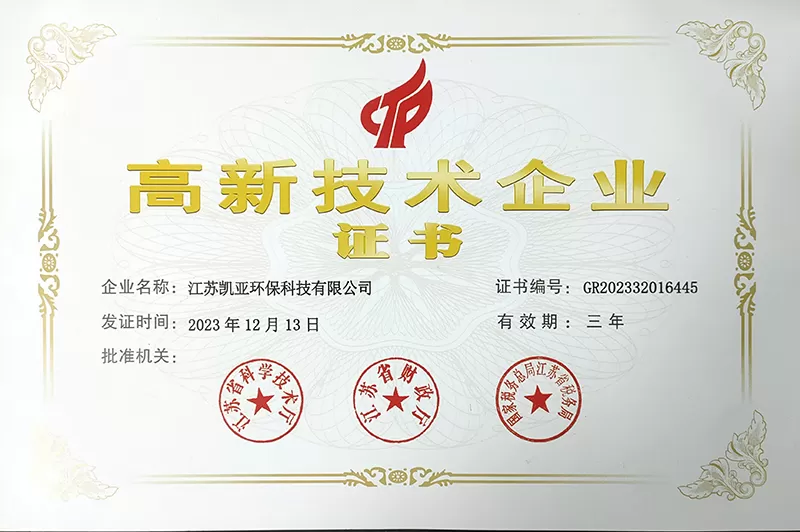 Jiangsu Kaiya Environmental Protection Technology Co., Ltd as a national high-tech enterprise, a private small and medium-sized technology enterprise in Jiangsu Province,  Jiangsu Kaiya Environmental Protection Technology Co., Ltd. has obtained the Level A certification for the integration of informatization and industrialization, CE certification, ISO certifications. It has also been awarded the title of "Jiangsu Province AAA-Level Integrity Demonstration Unit". Currently, the company has obtai...